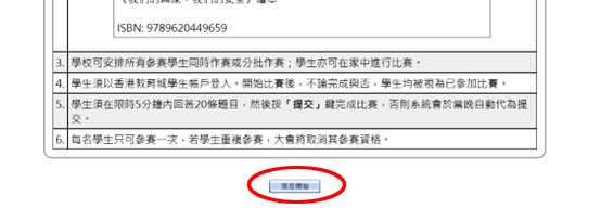 步驟5 | 開始後需要在5分鐘內完成20條題目,然後再按「提交」按鈕, 曾按開始鍵的學生不能再回答多1次。 |